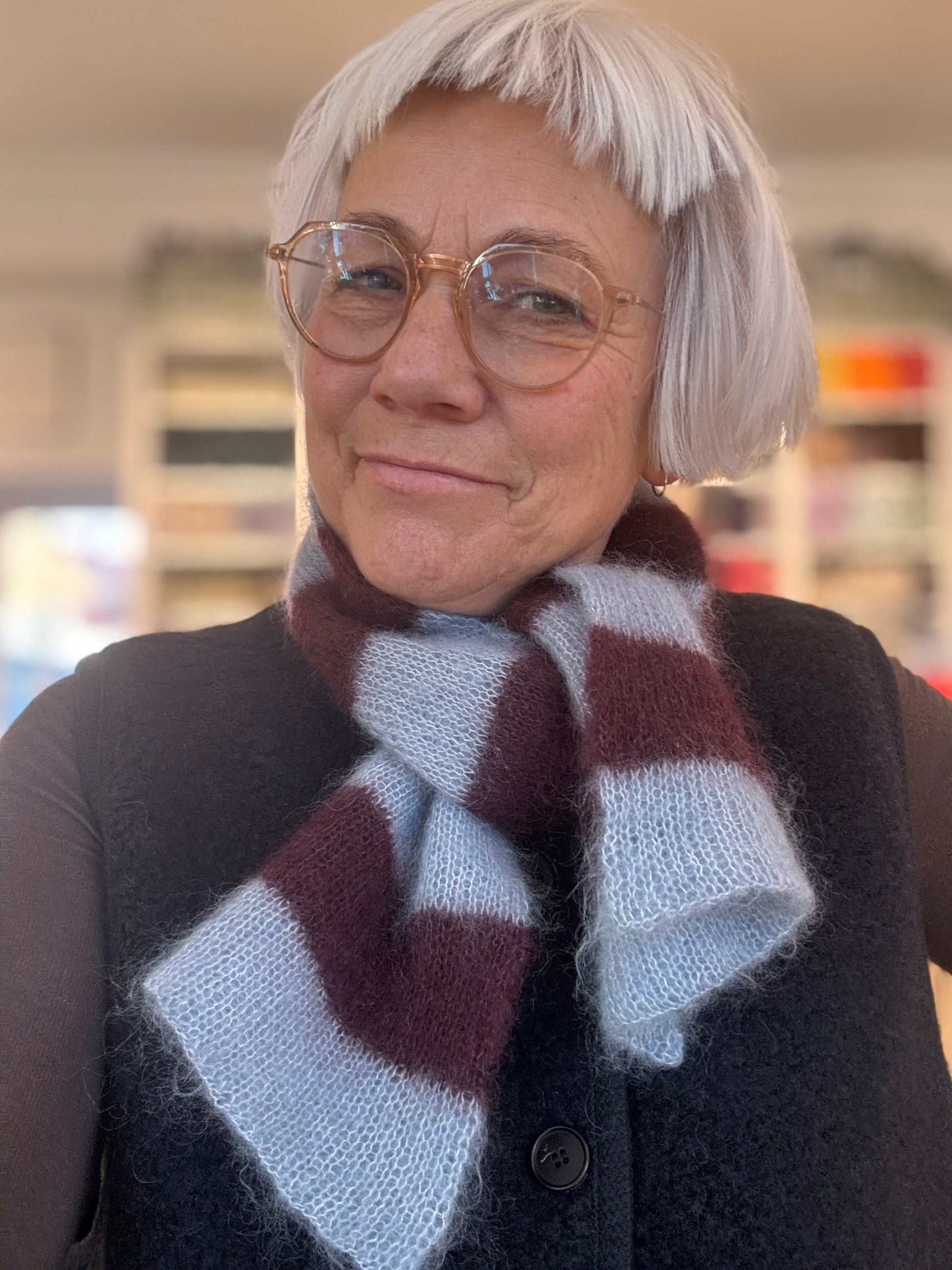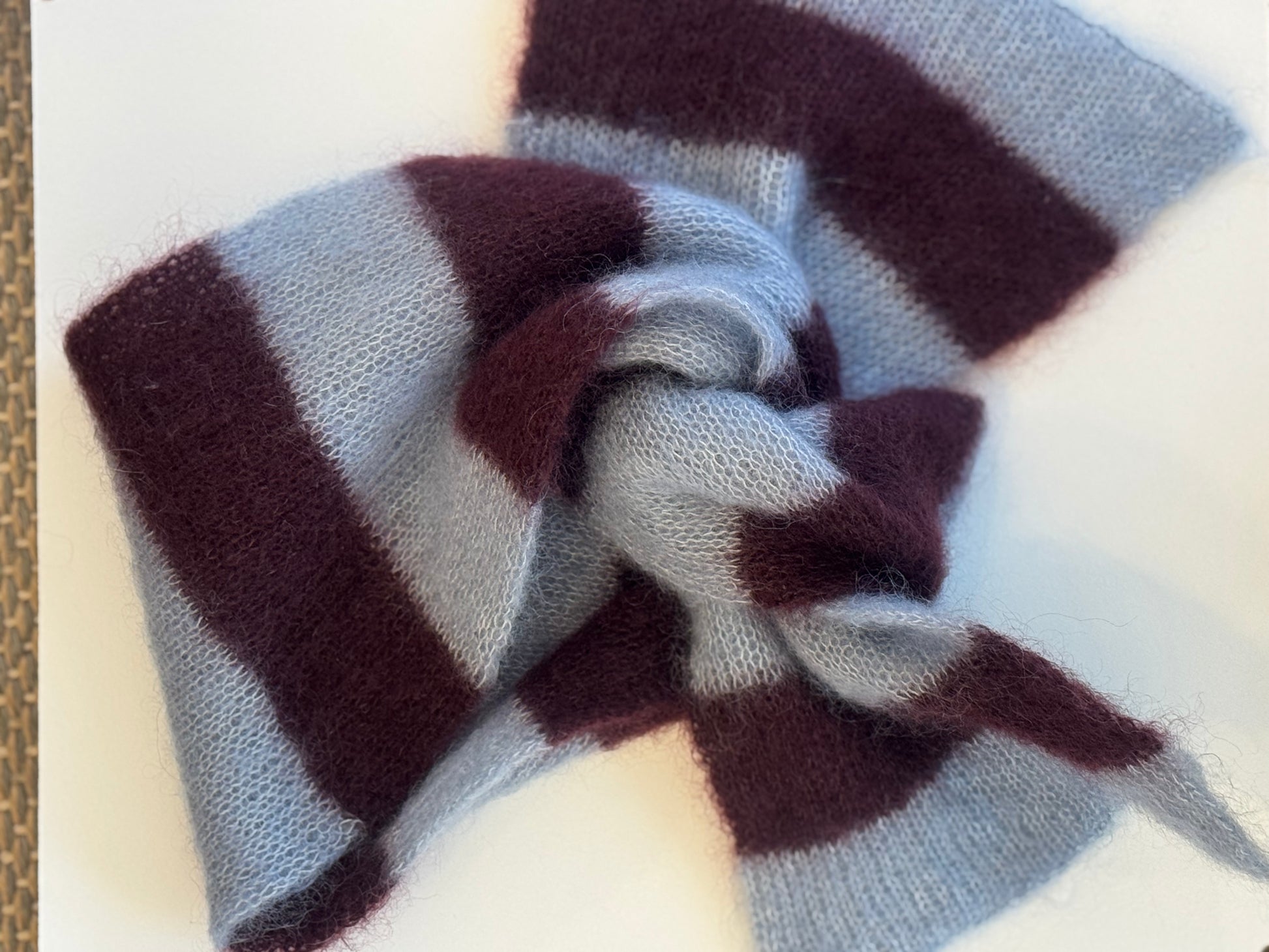 Tørklædet er strikket i dobbeltstrik med en tråd silk mohair. Her anvendes bordeaux og lyseblå.